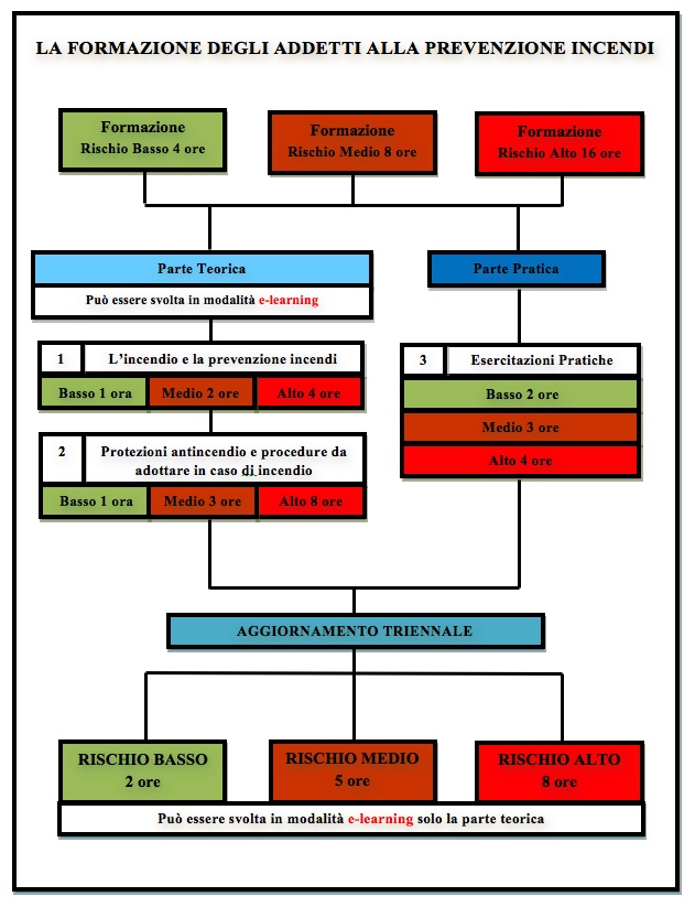 Nello schema sottostante è riassunta la durata e le modalità di formazione del Corso per Addetti alla Prevenzione Incendi: